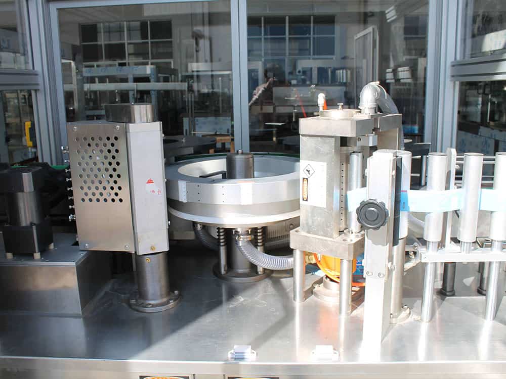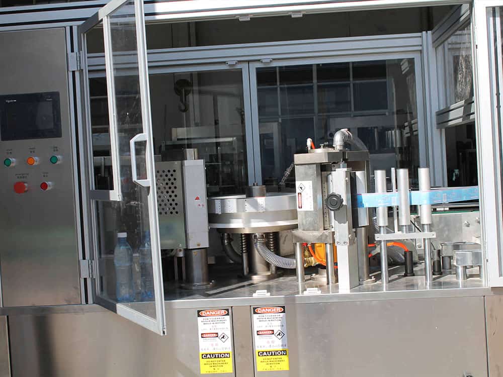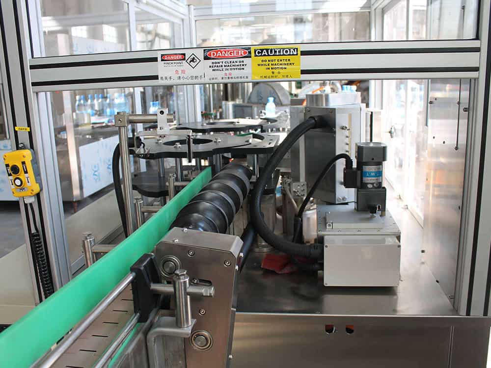 The bottles on conveyor arranged by planet wheel, glued labels were stickled to bottles in bearing position, and then the labels will be stickled well with the effect synchronization belt;