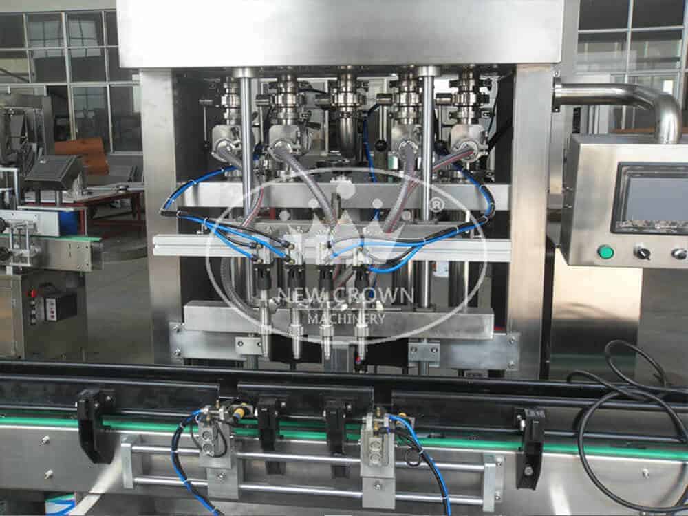 4 head glass bottle jar source piston filler filling machine is by using pistons to fill thicker, higher density liquid, such as olive oil, edible oil, engine oil, petrol, honey, soy source etc. can be apply to glass bottle, glass jar, plastic bottle and cans.