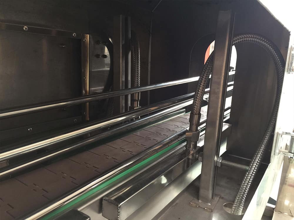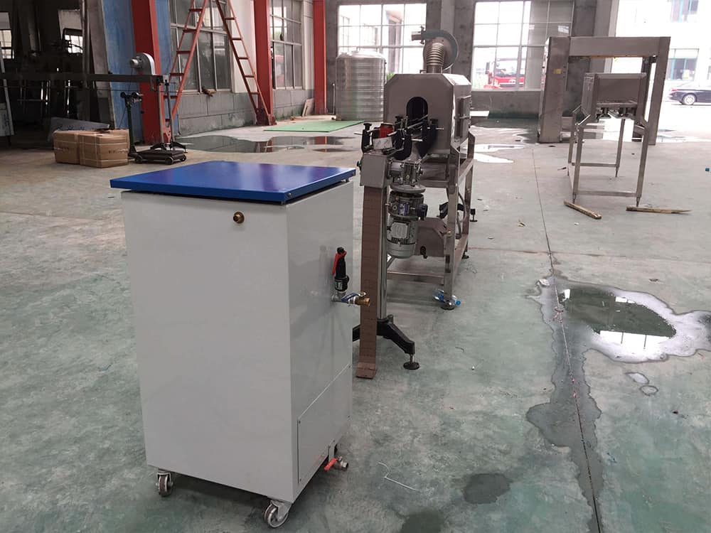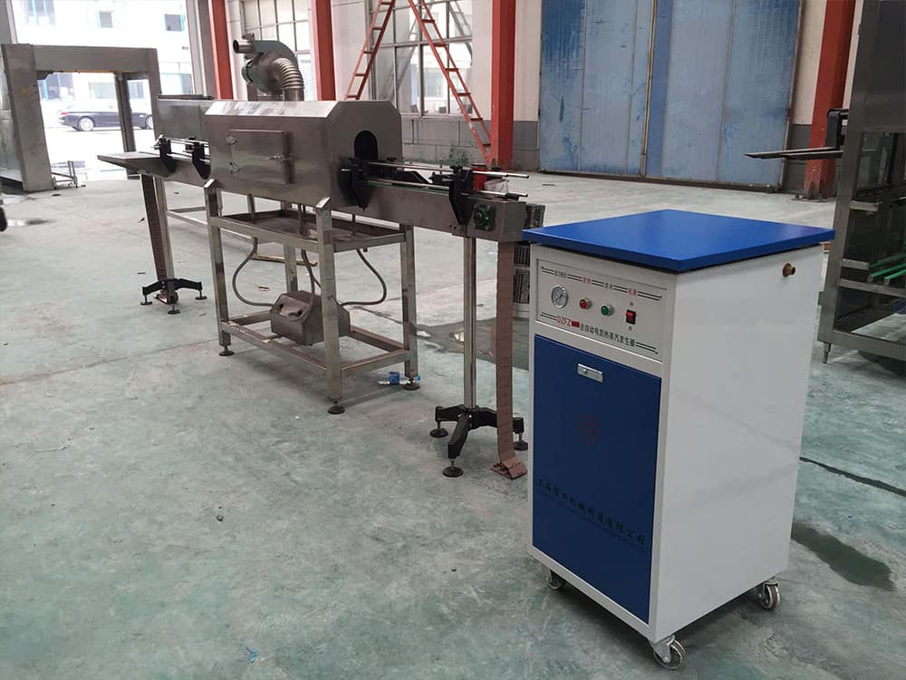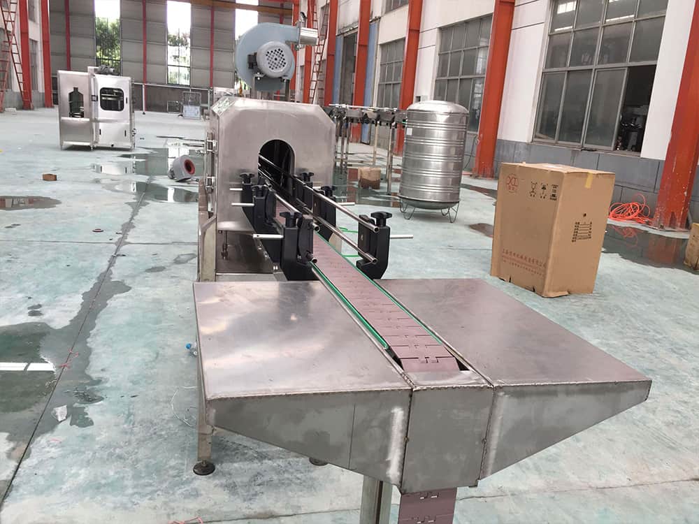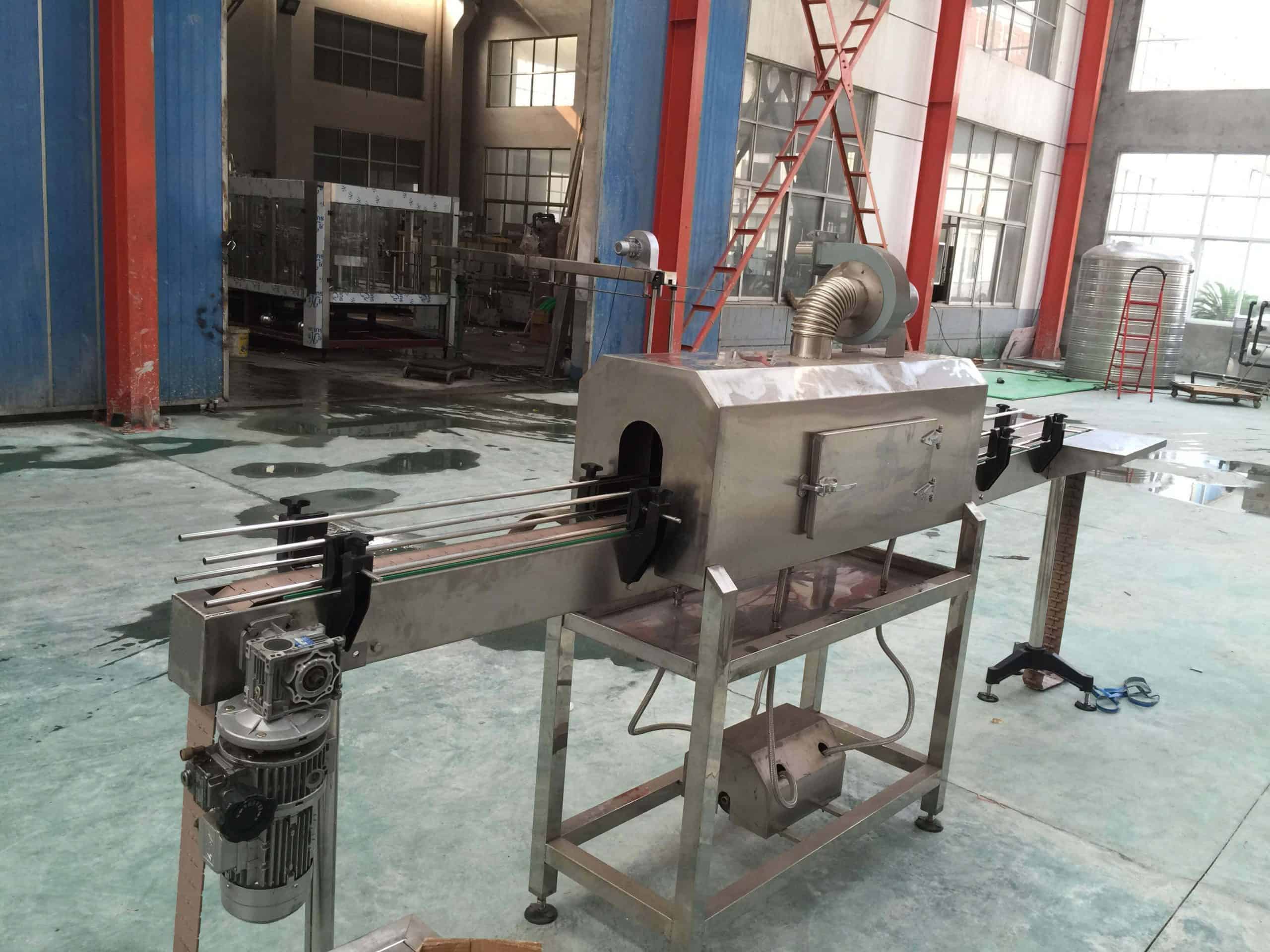 The labels are made piece by piece, and manually put labels on bottles. Then going through the shrinking tunnel which is connected with steam generator.