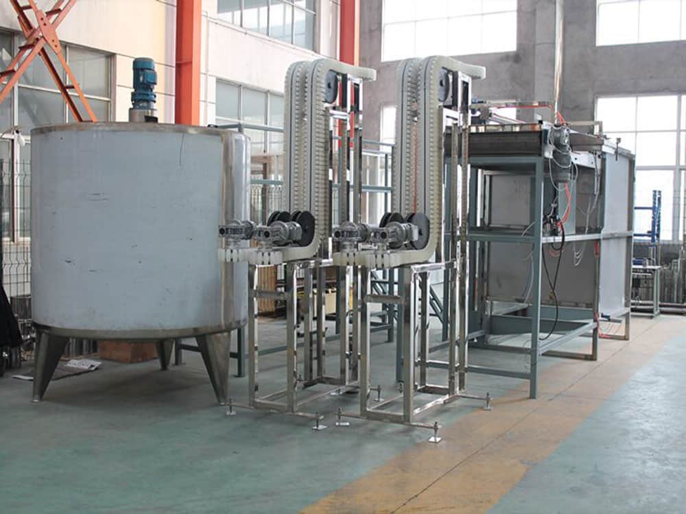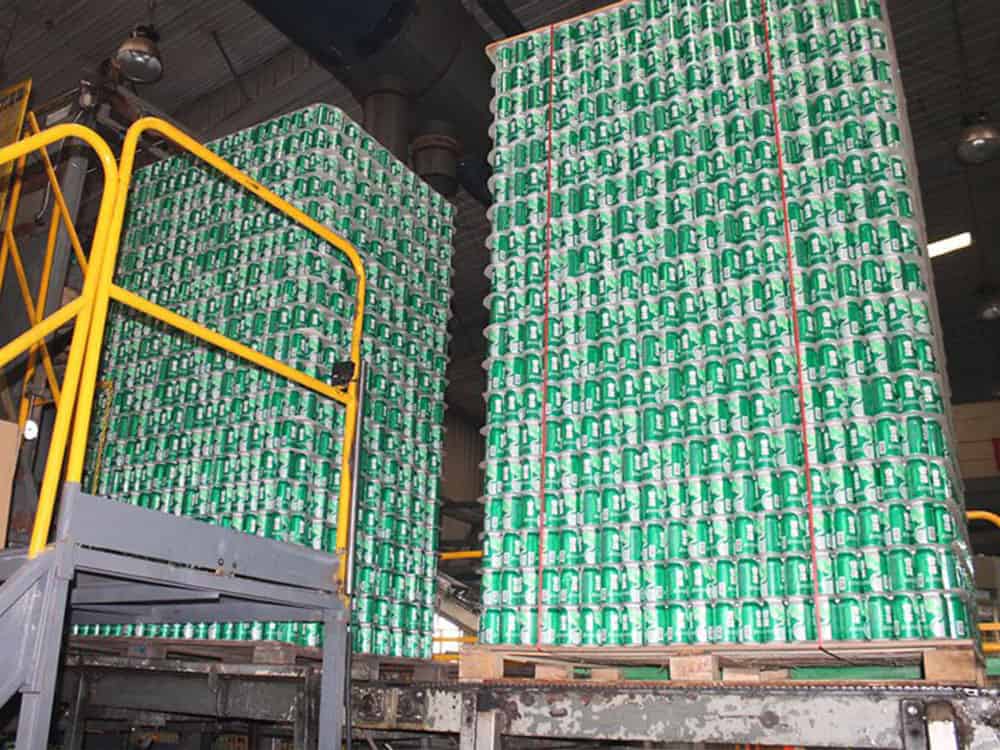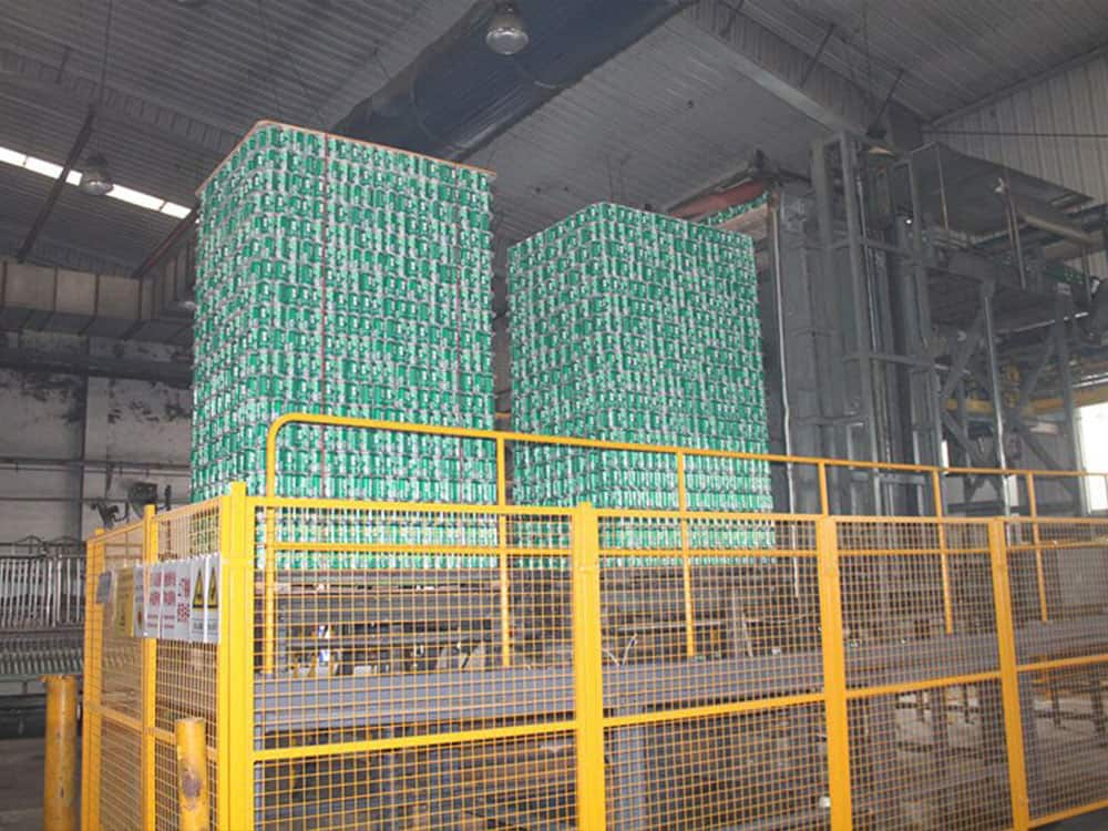 Work by forklift will fold full pallet on the pallet conveyor, conveyor then will to host the pallet lift tables. Pallet lifting platform is the empty cans of pallet after will locate in sent to the discharge tank height, when after unloading the empty cans, then puts the empty pallet fall on the conveyor. All the rise and fall of action by the elevator system control device, and can adjust the speed of rising or falling alone, to meet the operational needs. Discharge empty cans is pushed by cylinder device cans, sky can sent to discharge tank height sensors in place after tank cylinder began to press, can push the whole layer of empty cans to net on the conveyor, and then return to prepare position, will continue to the next layer out. After unloading the empty cans empty pallet, by empty pallet conveyor transferred to empty pallet vertebral product, then on the stack to a certain height, reoccupy forklift pallet will be moved out.