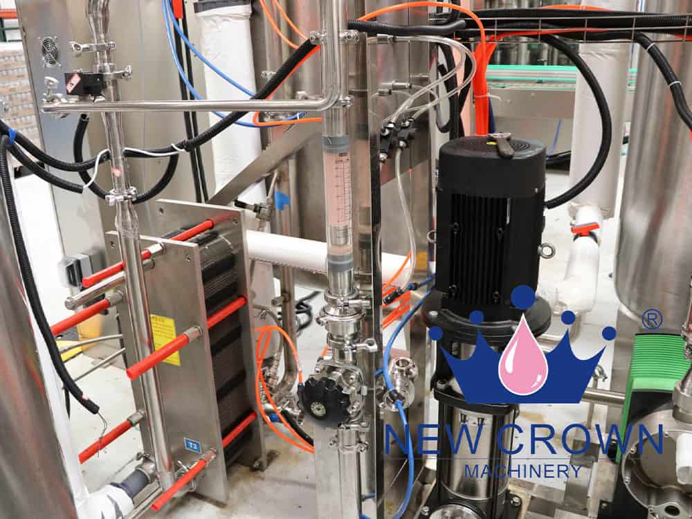 2) Mixing tank: one of the most important part of carbonation system. It can automatically mixing water and syrup in certain stable speed. Also has the advantage of precision mixing and easy control of production capacity and ratio of different ingredients. Liquid level of water tank, syrup tank and additives’ tank is control by flowing ball and Pneumatic valves, which ensures the stability of liquid level, so to keep highly consistency of soft drink brix in different production batches. Meanwhile input CO2 to keep water from Oxidation.